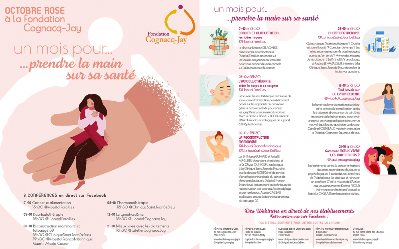 Cette année, la Fondation Cognacq-Jay et ses établissements se sont mobilisés pour proposer des visio-conférences au personnel soignant et public, des expositions et également des webinars. Sous la forme de rendez-vous Facebook Lives avec des praticiens, les personnes pouvaient assister aux conférences, consulter les supports et poser des questions dans le chat. Des conférences portant sur différents thèmes (l’auriculothérapie, la reconstruction mammaire, l’hormonothérapie, le lymphœdème, comment mieux vivre avec les traitements, les gestes qui sauvent et les pratiques alimentaires) et disponible en replay.